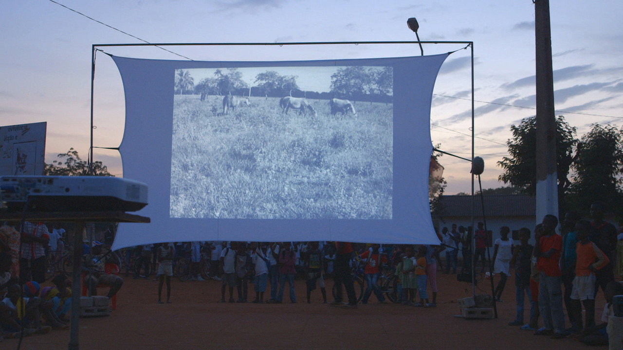The first image is in black and white, upside down and projected into a black box that then becomes the frame. It now hovers like a time capsule near a man’s face. He looks down, listening in on a female guerrilla fighter and translating her words from Fulani. Within the capsule, money is counted and paid out as a new currency, the numbers of the years run backwards in the black box. A 16-mm film glides through the man's hands and is transferred to a laptop screen frame by frame.