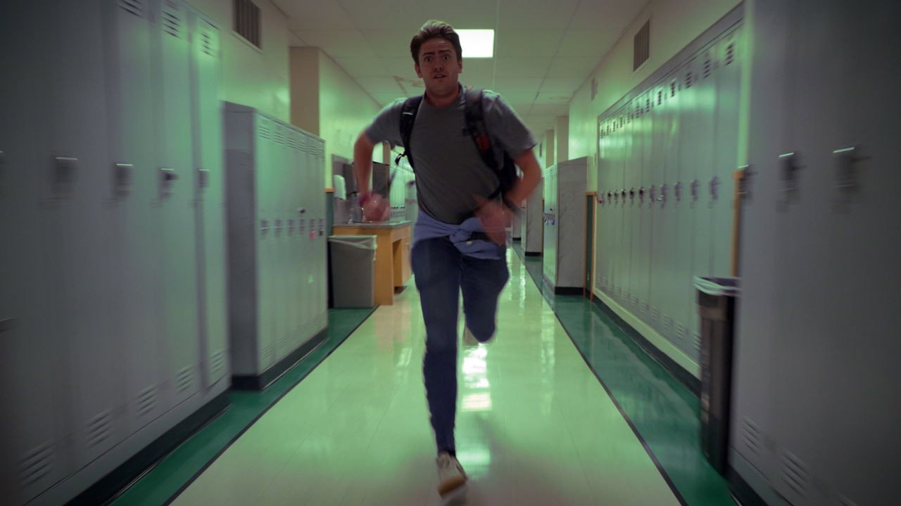 After a long day of editing, Bryson exits the lab and enters the hall to find a dark, glowing figure at the end of it.